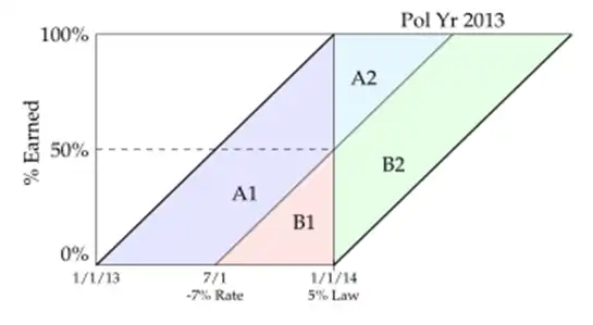 - The average date for this portion is 1/1/12. So, the average policy will have 3 months remaining after the law change on 10/1/12 (i.e. 3months between 10/1/12 \(\to\) 12/31/12)