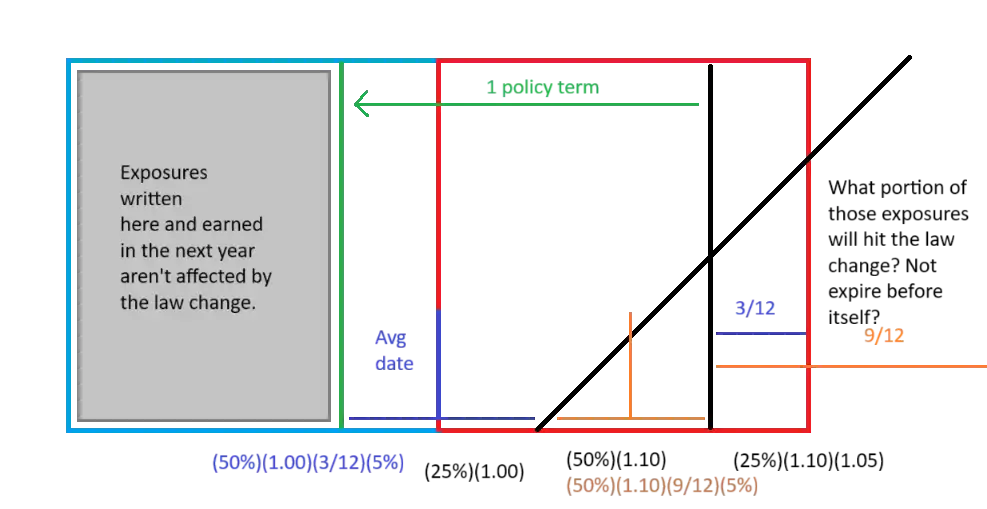 The complexity arises from the fact that policies written before the PY even started, but since the law change happened during the PY in question, the extra premium from that would be associated with not the previous PY, but the current one. For example, if we are looking at PY 2025, and there was a law change of +5% on July 1, 2025… then some policies written in 2024 have to get revised if they are in-force during July 1. In such a case, the extra premium of 5% \(\times 1000 = 50\) will be part of PY 2025, and we have to account for that in our calculation. ↩