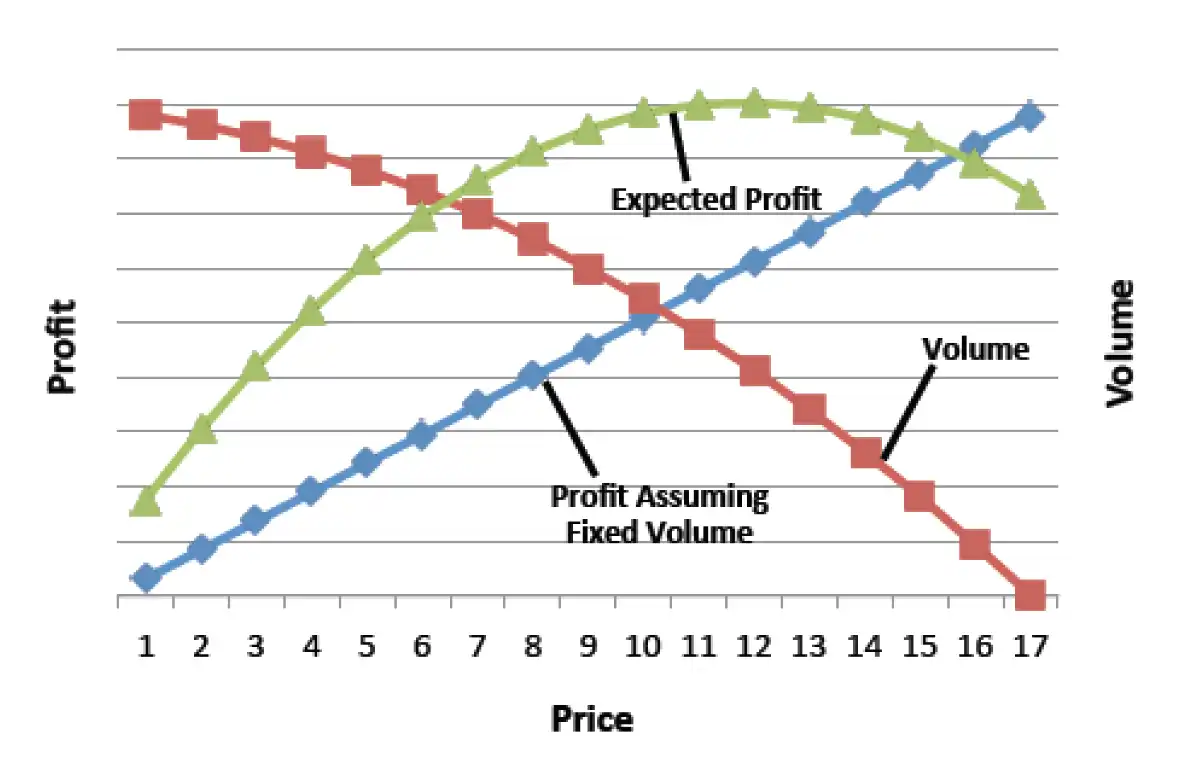- Blue = Profit based on price charged. For a fixed indicated cost per policy, they are directly proportional (also assuming volume is fixed)