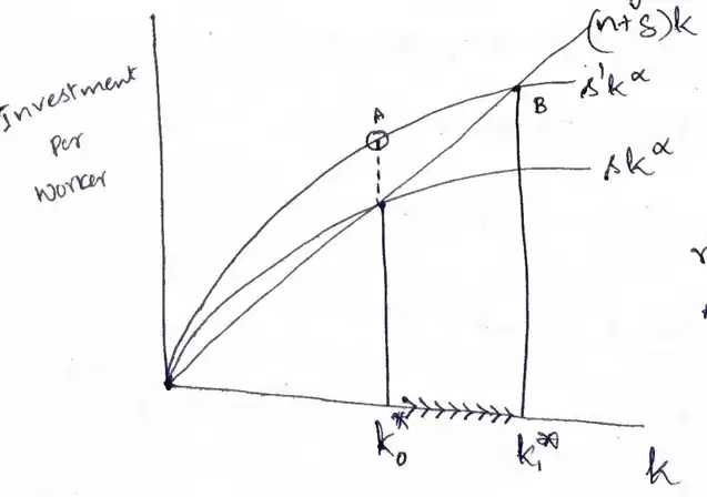 With an increase in saving rates, \(s'k^\alpha\), \(sy \gt (n+\delta)k\) thus, the gross investment per worker is higher than the machines that could be afforded before, thus the capital increases to ensure that \(k\) remains the same.
