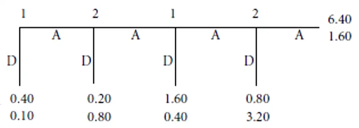 2. \(P(\text{playing D})\) increases as we move closer towards the last node.