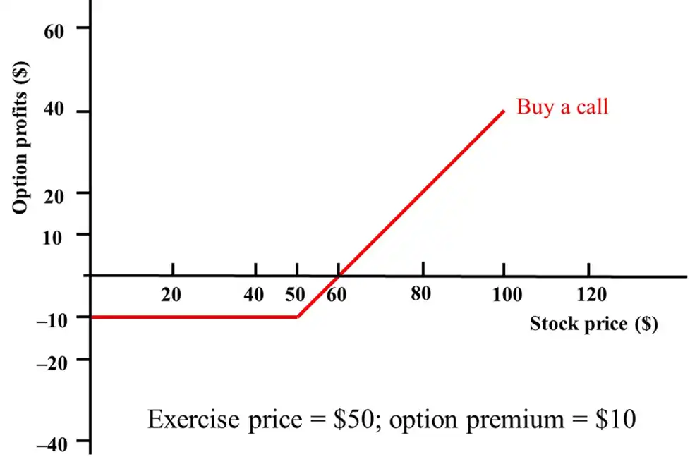 - the buyer of call, will buy asset at the strike \(\implies\) profits for him.