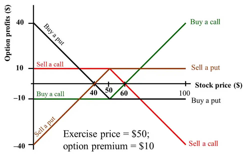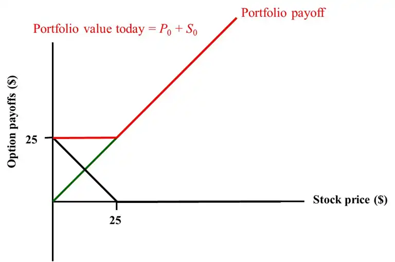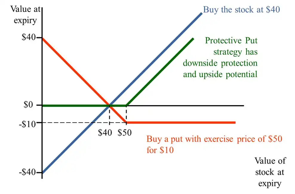 - Alternate scenario, if Strike price was 45, then draw the same diagram and you will see that the green line (of the Protective Put strategy) starts from -5 and elbows at 45 then goes up, touching the x-axis at 50