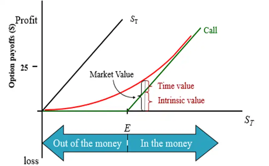 Thus, market value lies between \(S_{T}\) curve and the Intrinsic call value line.