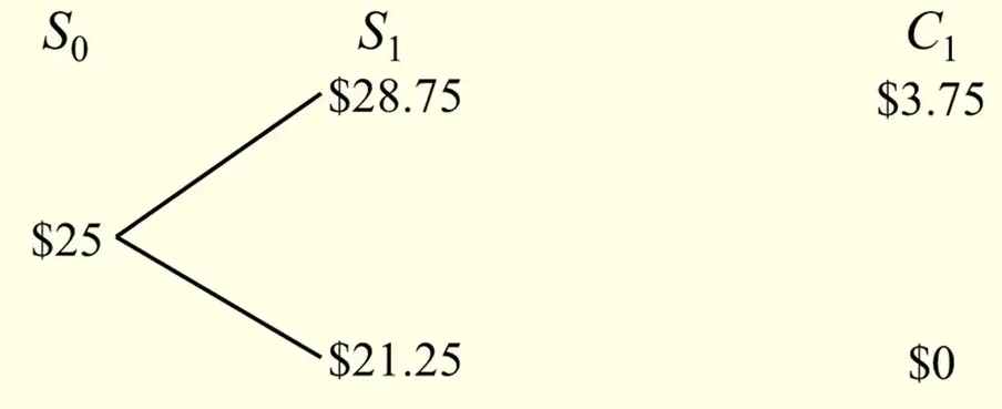 - At \(t=1\), \(S_{1}\) is either 15% more or 15% less (28.75 or 21.25)
