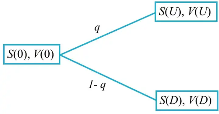 Thus we can find \(q\) since we already observe \(S(0)\), and have speculations about what "up" and "down" movements will show up at which \(R_{f}\) rate of interest.